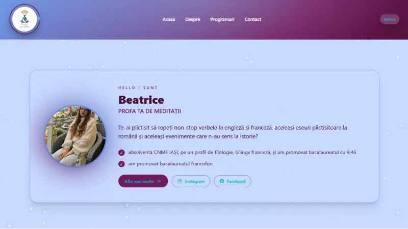 "Il recomand cu drag pe dl Maxim. Mi-a deschis un site dupa cerințele mele care imi face viata mai ușoară in ceea ce priveste organizarea. Acest site prezintă toate informatiile esențiale promovării mele, si programărilor viitorilor cursanți pentru meditații pentru bacalaureat si limbi străine. Am discutat din timp, am ales cele mai bune variante atât dpdv. Al design-ului, cat si al informațiilor prezentate pe site. Colaborare a fost minunată, Max pliandu-se pe toate dorințele mele. Este un om pe care te poti baza oricând si care isi da interesul sa aibă clienți mulțumiți. Raportul preț calitate este genial, reusind, de asemenea, sa plătesc si in transe, pentru o mai buna organizare a bugetului. S-a oferit de asemenea, sa ma sfătuiască in anumite cazuri si sa imi arate cum pot sa imi îmbunătățesc prezenta media. Recomand cu drag tuturor celor in cautare de profesionalism!"